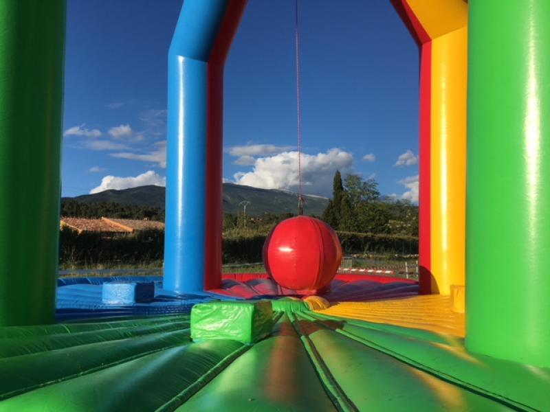 La structure Demolition Ball est un jeu d'adresse et de force physique où chaque participant se tient sur un plot et essaie de renvoyer une grosse boule à ses adversaires pour les faire tomber de leur plot.